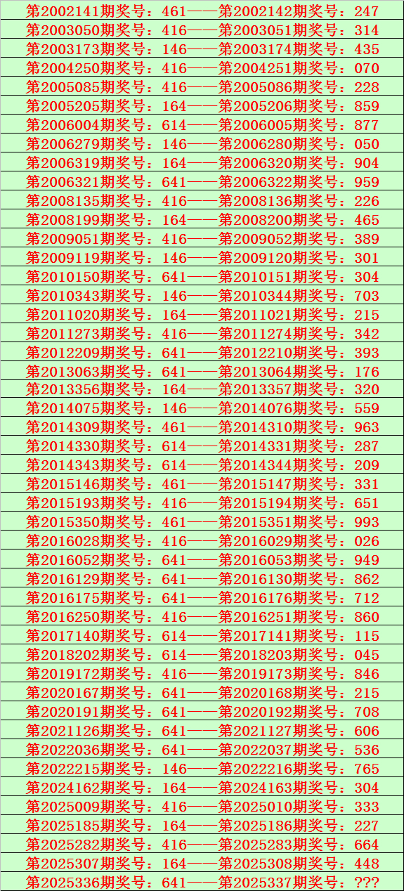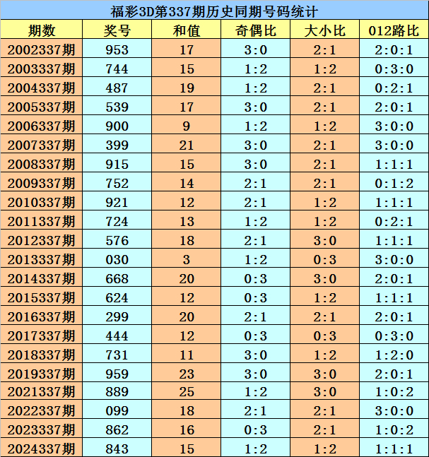 福彩3D第2025337期开奖日期:2025年12月17日,历史上第337期已开出了22次奖号,历年同期号码分别为:953、744、487、539、900、399、915、752、921、724、576、030、668、624、299、444、731、959、889、099、862、843。